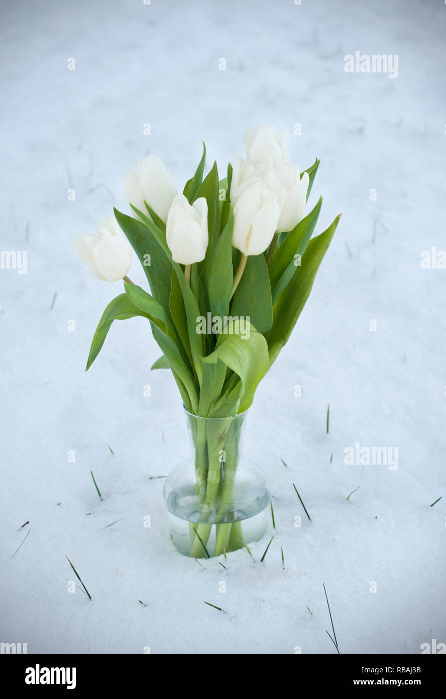 A Bouquet Of White Tulips In The Glass Vase On The Snow Beautiful
