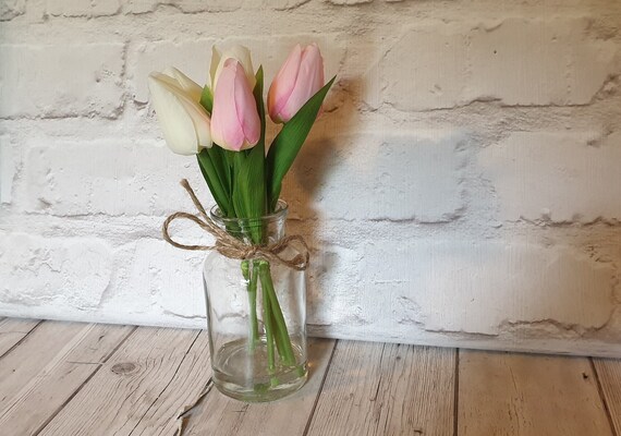 Artificial Tulips In Glass Jar Bottle Vase Jute Bow Home Decor Etsy