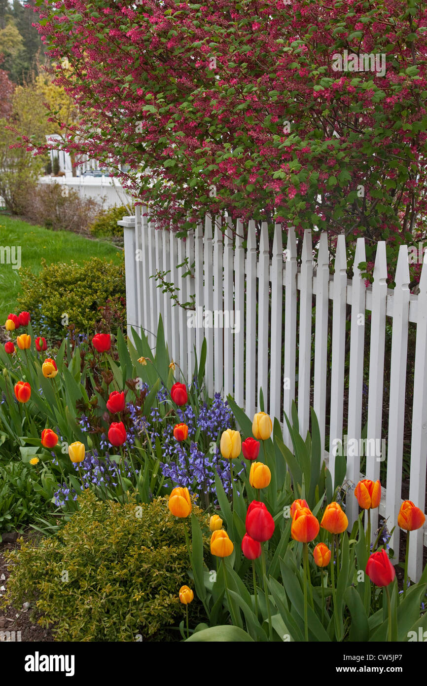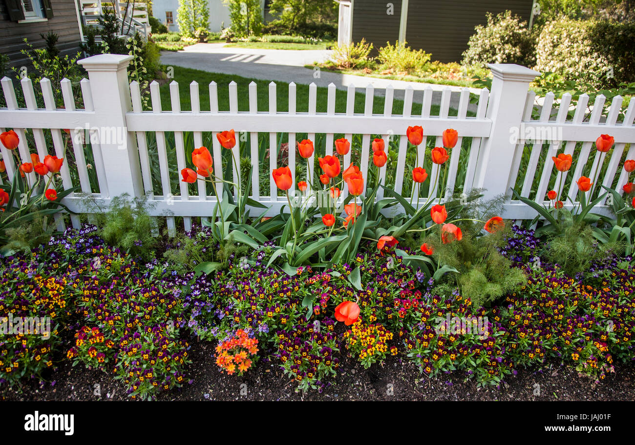 Tulips In Front Of White Picket Fence Stock Photo 49911631 Alamy