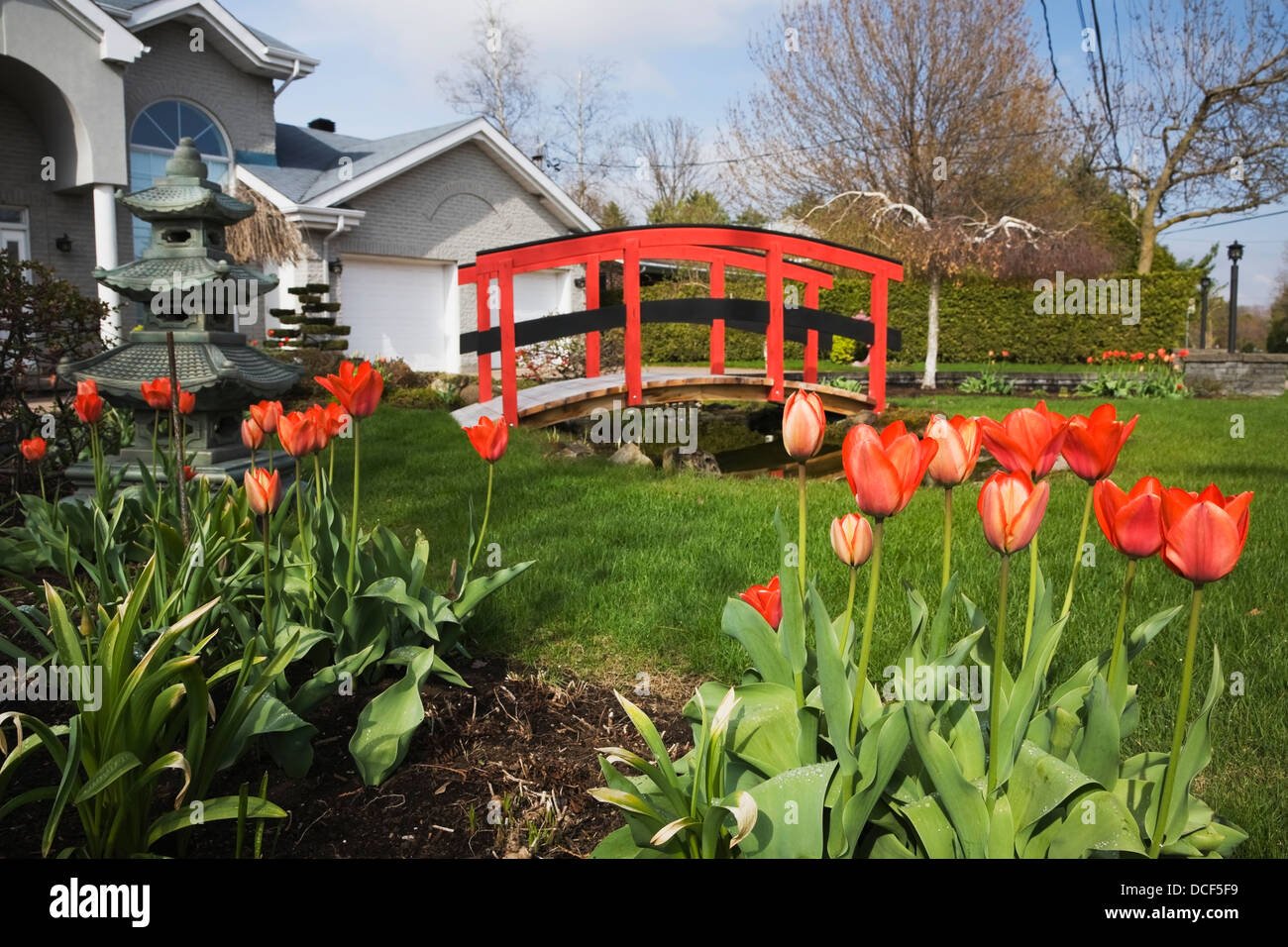 Red Tulips And A Wooden Bridge In A Landscaped Residential Front