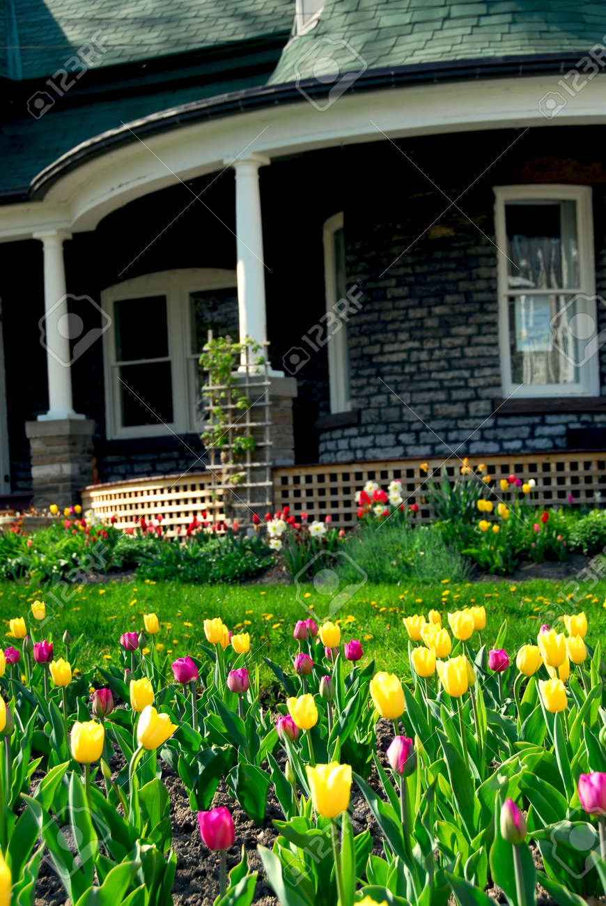 Spring Garden In Front Yard Of House With Colorful Tulips Stock