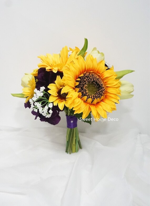 White Purple And Yellow Bridal Bouquet In Sunflowers Tulips