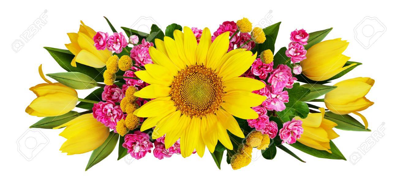 Sunflower Tulips And Hawtorn Flowers Arrangement Isolated On