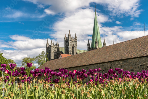 Nidaros Cathedral In Trondheim With Violet Tulips In The