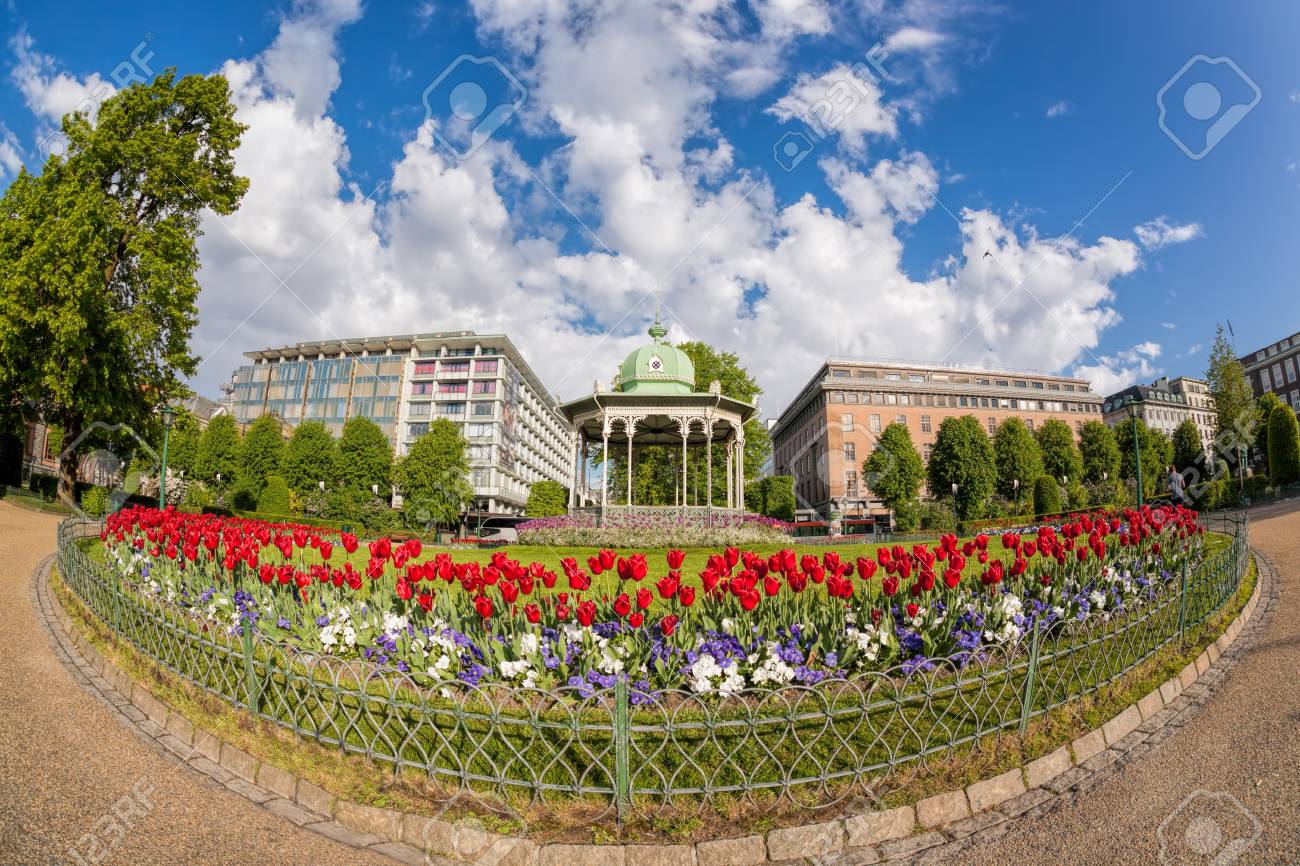 Fountain With Spring Tulips In Bergen Norway Stock Photo
