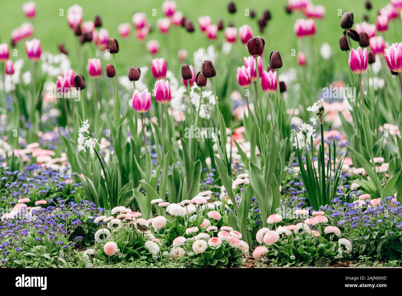 Hd Wallpaper Pink And Red Tulips With Yellow Daffodils Field