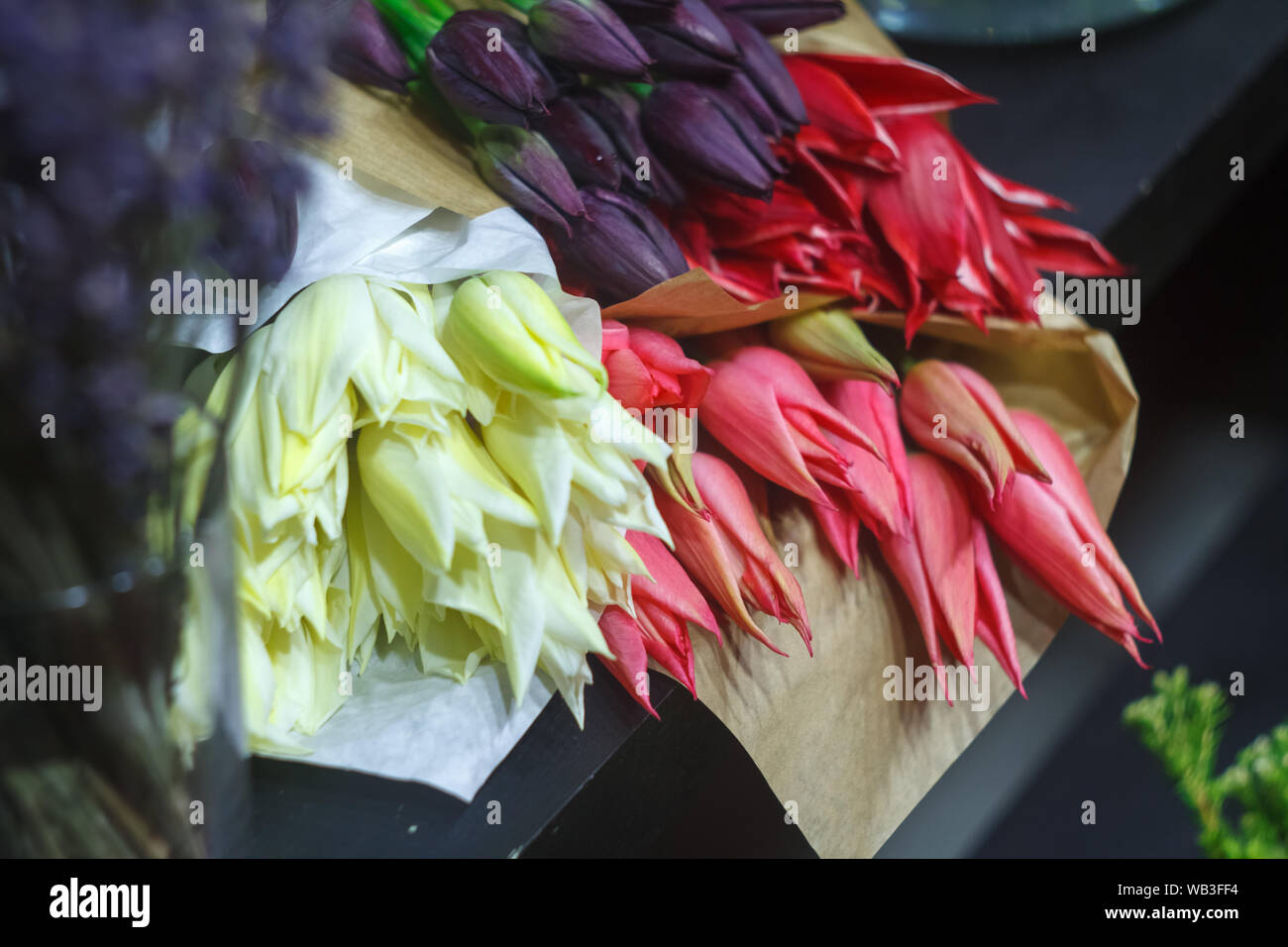 Close Up Assortment Of Flower Shop Red Pink Purple White