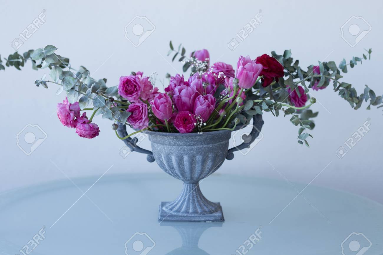 Pink Ranunculus Pink Tulips And Eucalyptus Arrangement In Iron