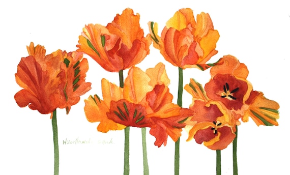 Watercolor Flower Painting Orange Parrot Tulips Original By Etsy