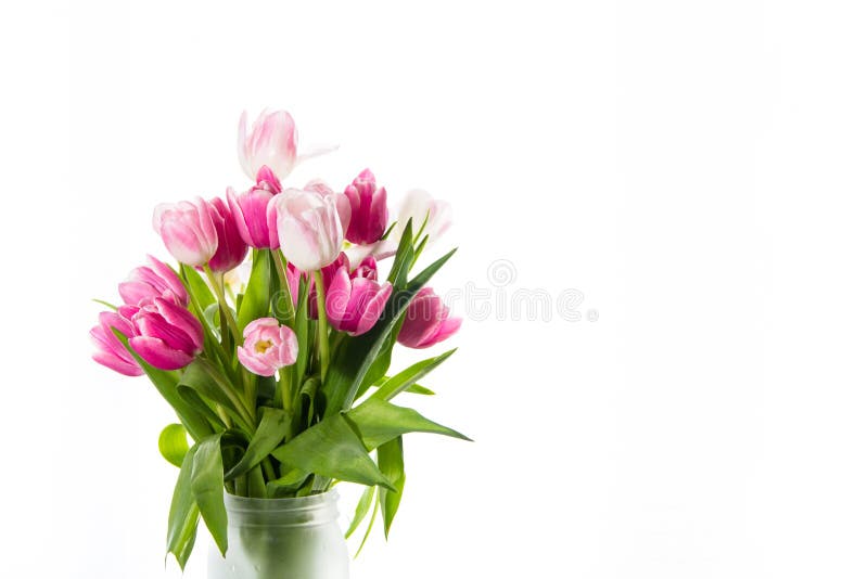 Bunch Of Peachy Tulips In A Mason Jar Isolated On White Stock