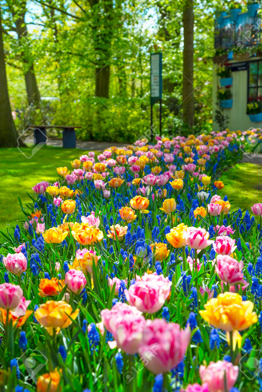 Garden In Keukenhof Tulips And Daffodils In The Spring