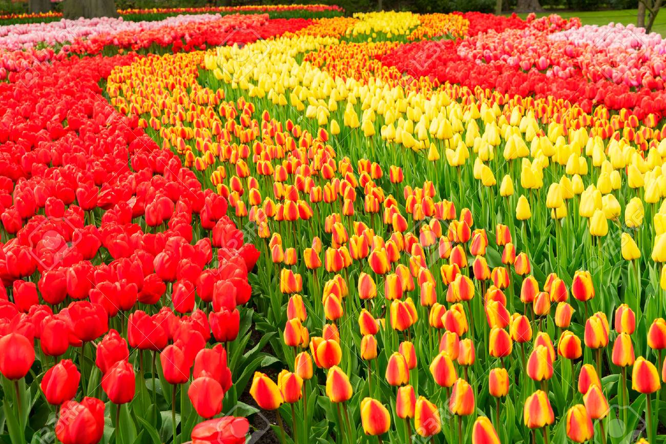 Rows Of Red Orange And Yellow Tulip Flowers In Garden Keukenhof