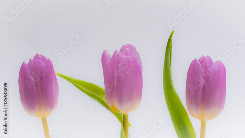 Beautiful Light Purple Tulips With Leaves Isolated On White