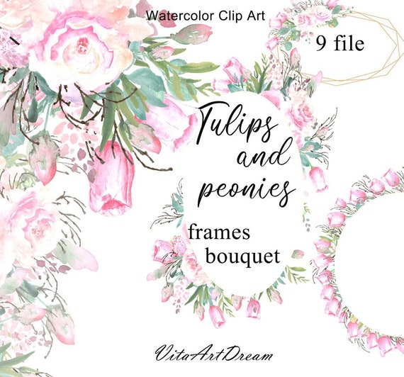 Watercolor Blush Flower Clip Art Tulip Peony Frame Hand Etsy