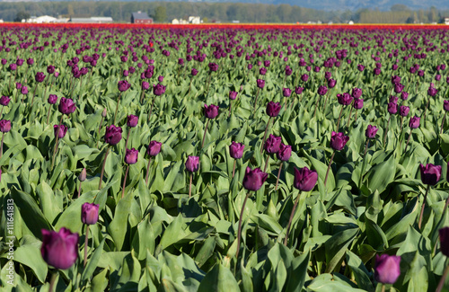 Field Of Purple Tulips Growing With Farmhouse In The Background