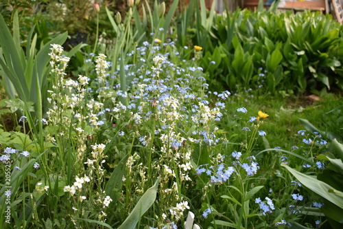 Spring May Blooming Garden Blue Forget Me Not Flowers Tulips