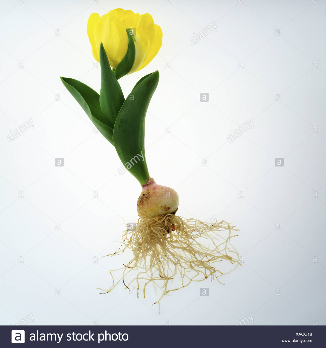 Close Up Of Tulip Flower With Roots Against White Background Stock
