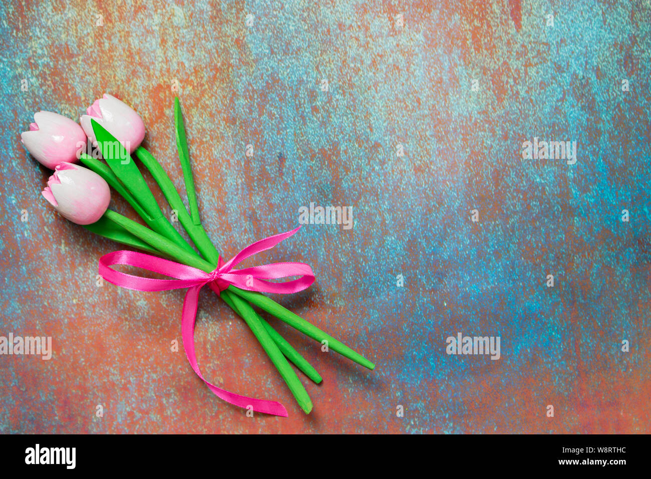 Decorative Artificial Pink Tulips And Hearts Against Blue Sky