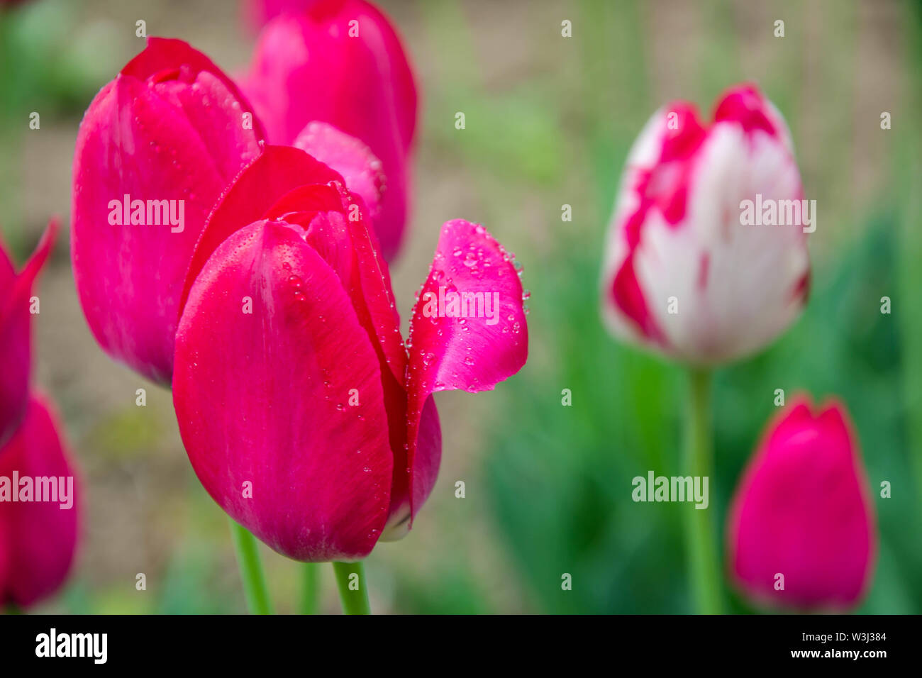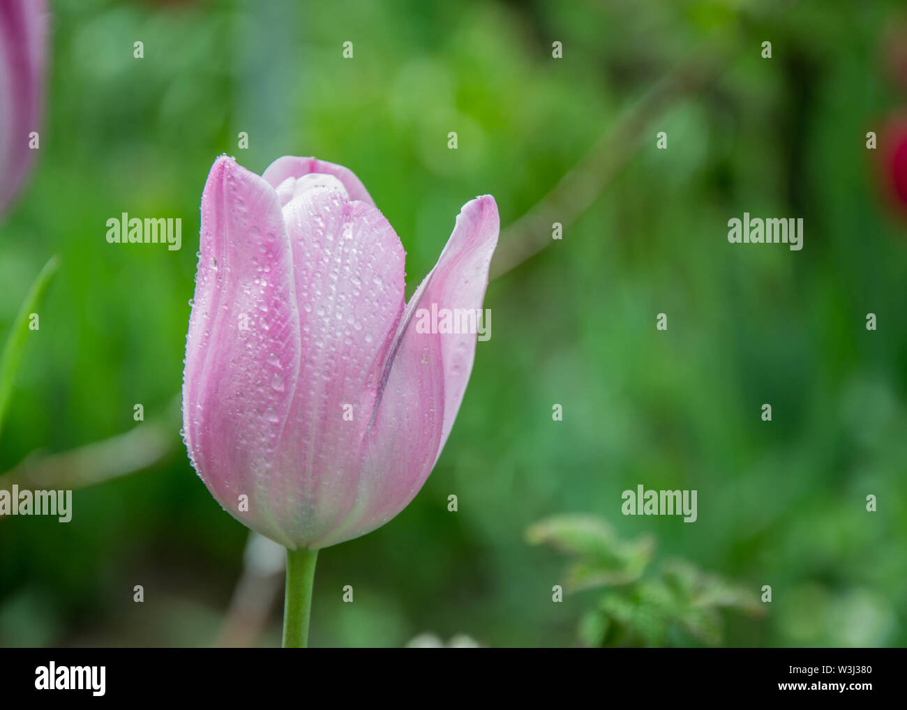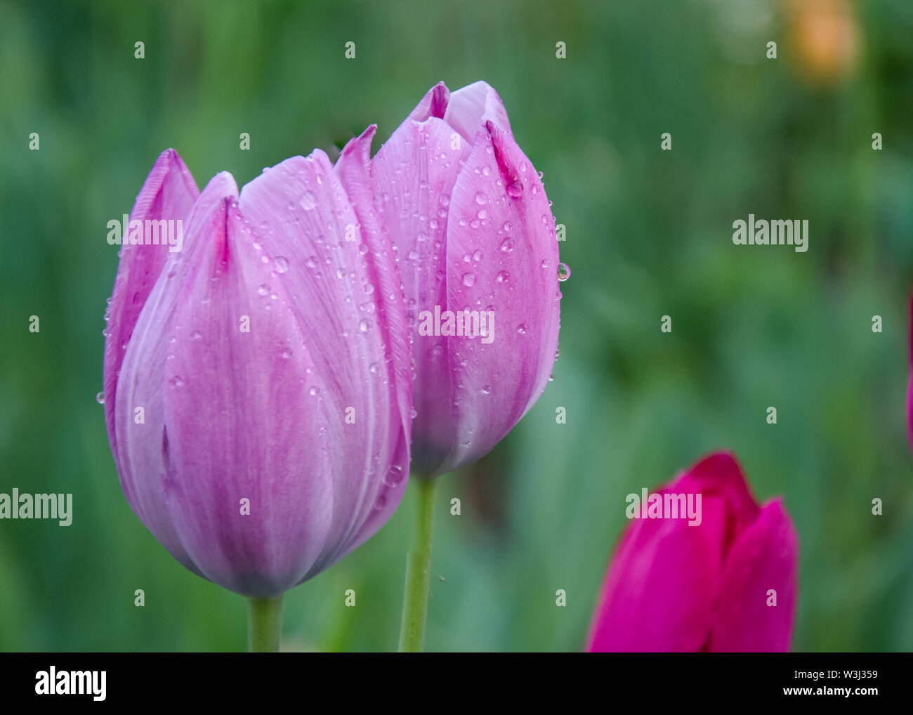 Closeup Of Beautiful Pink Tulips With Water Drops With Blurred