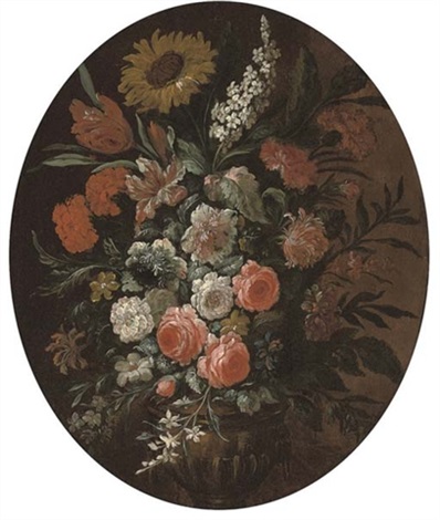 Roses Carnations Tulips A Sunflower And Other Flowers In An Urn
