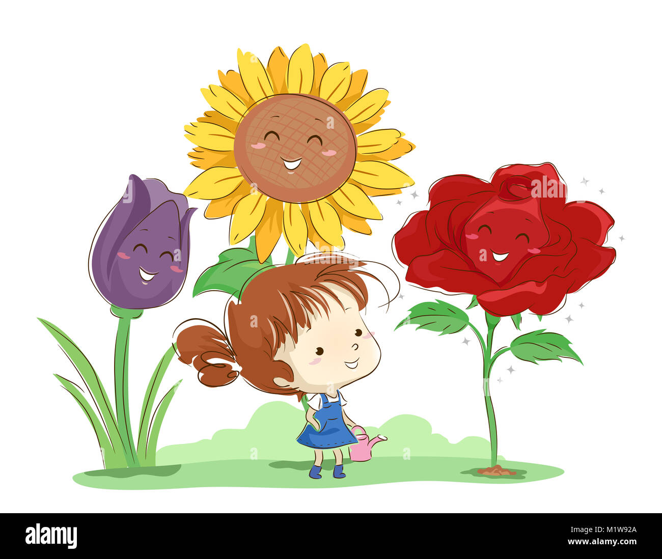 Illustration Of A Kid Girl Holding A Watering Can Surrounded By